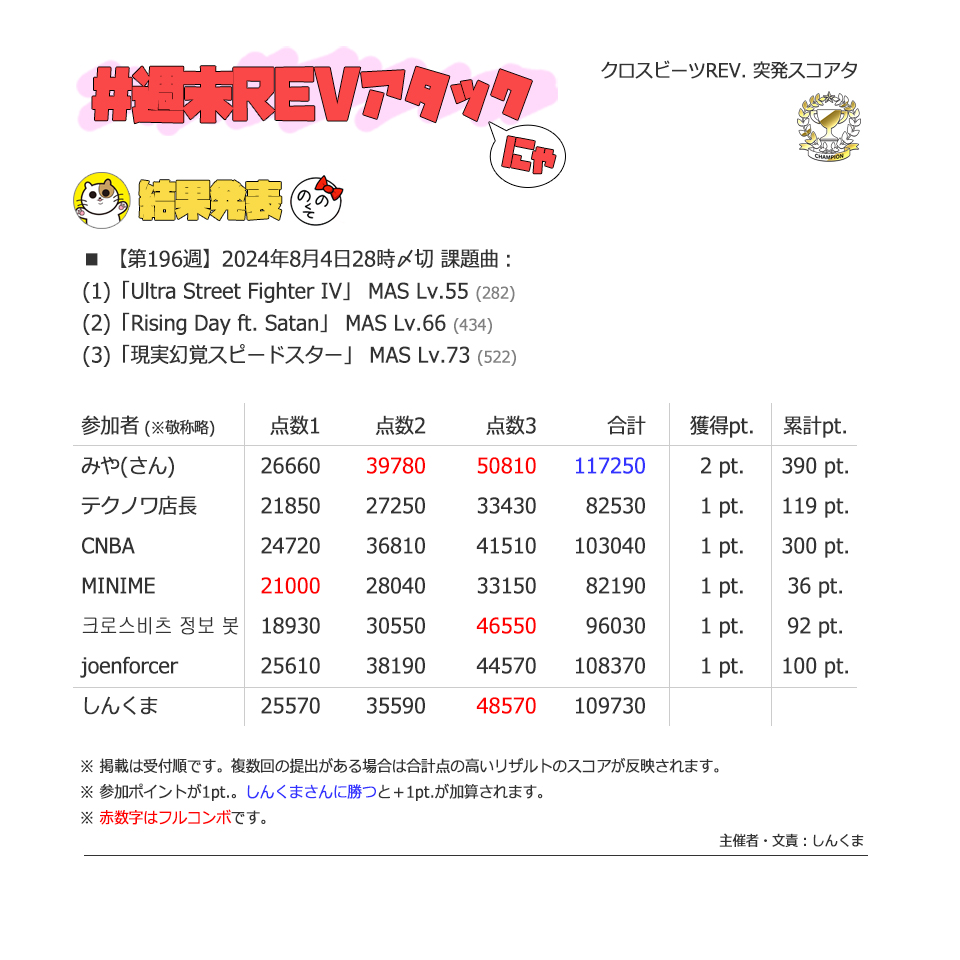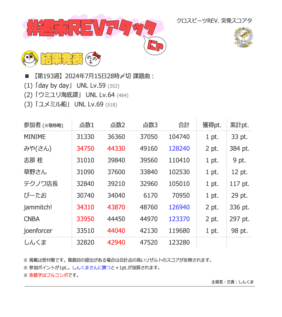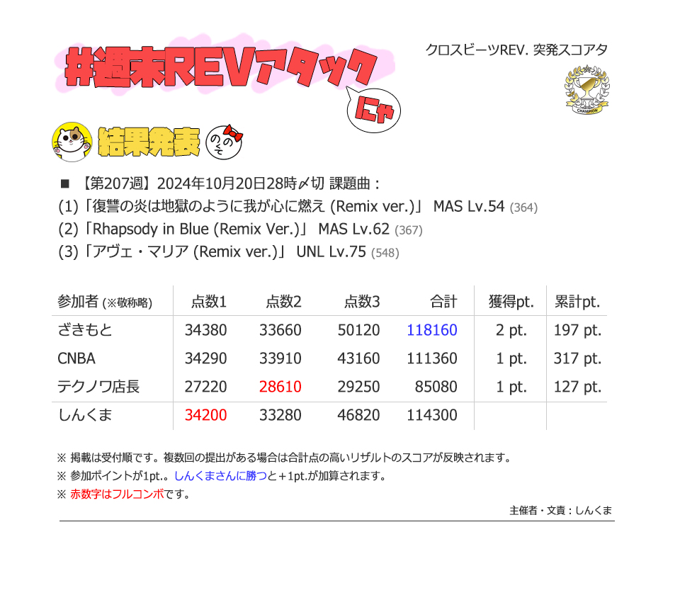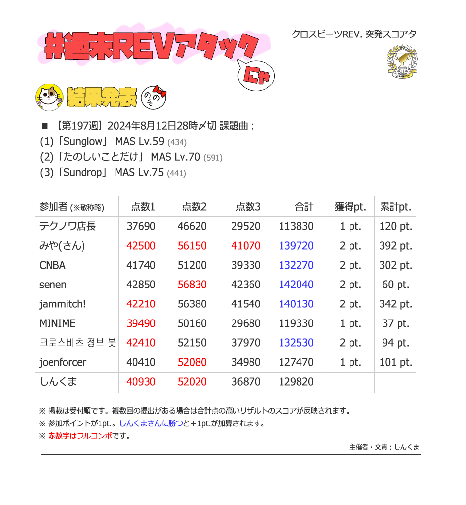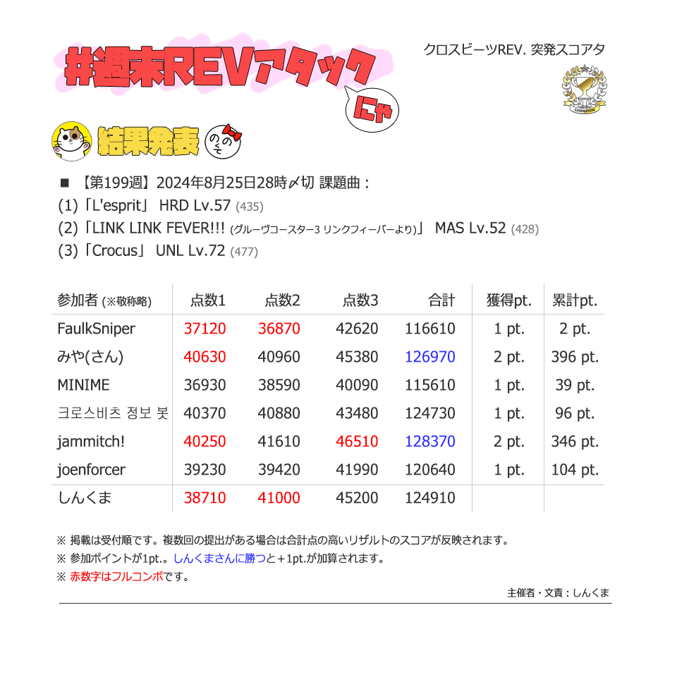 | #3 | 2020/9/27 | ちょっと変化球だけどハマると楽しい譜面 | Cthugha 73 |