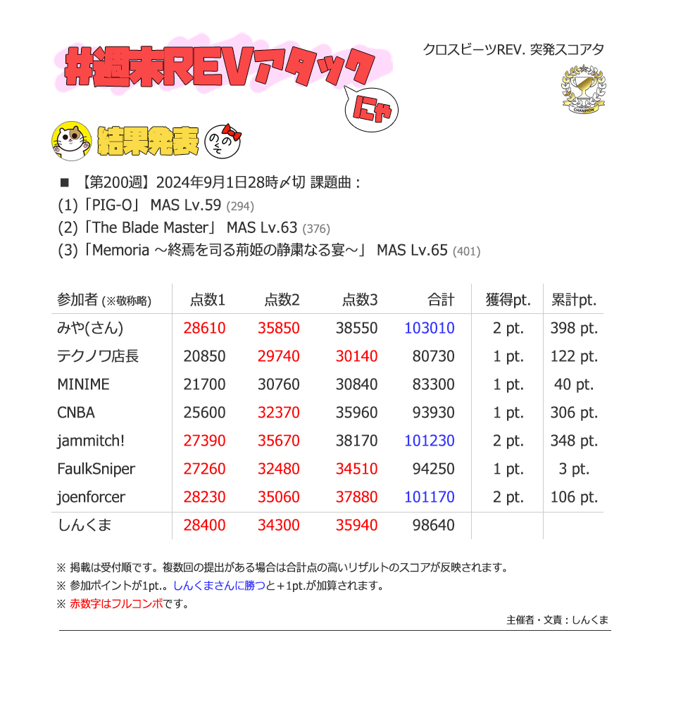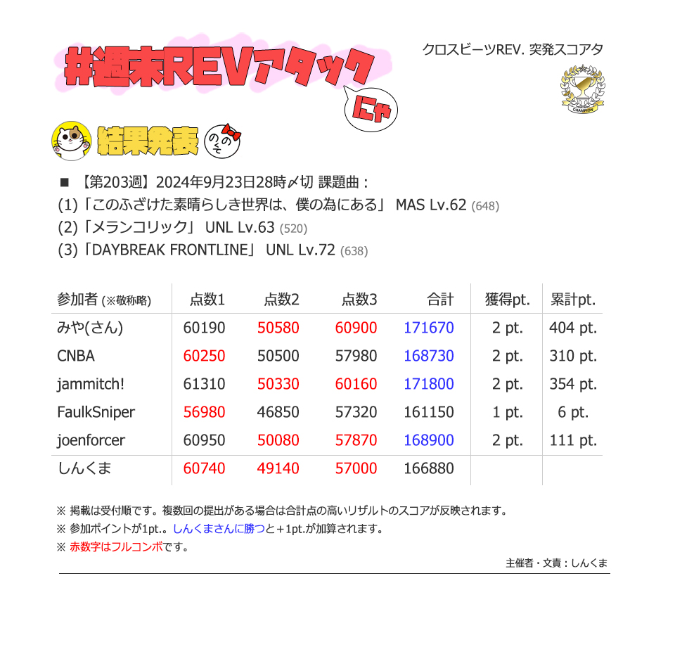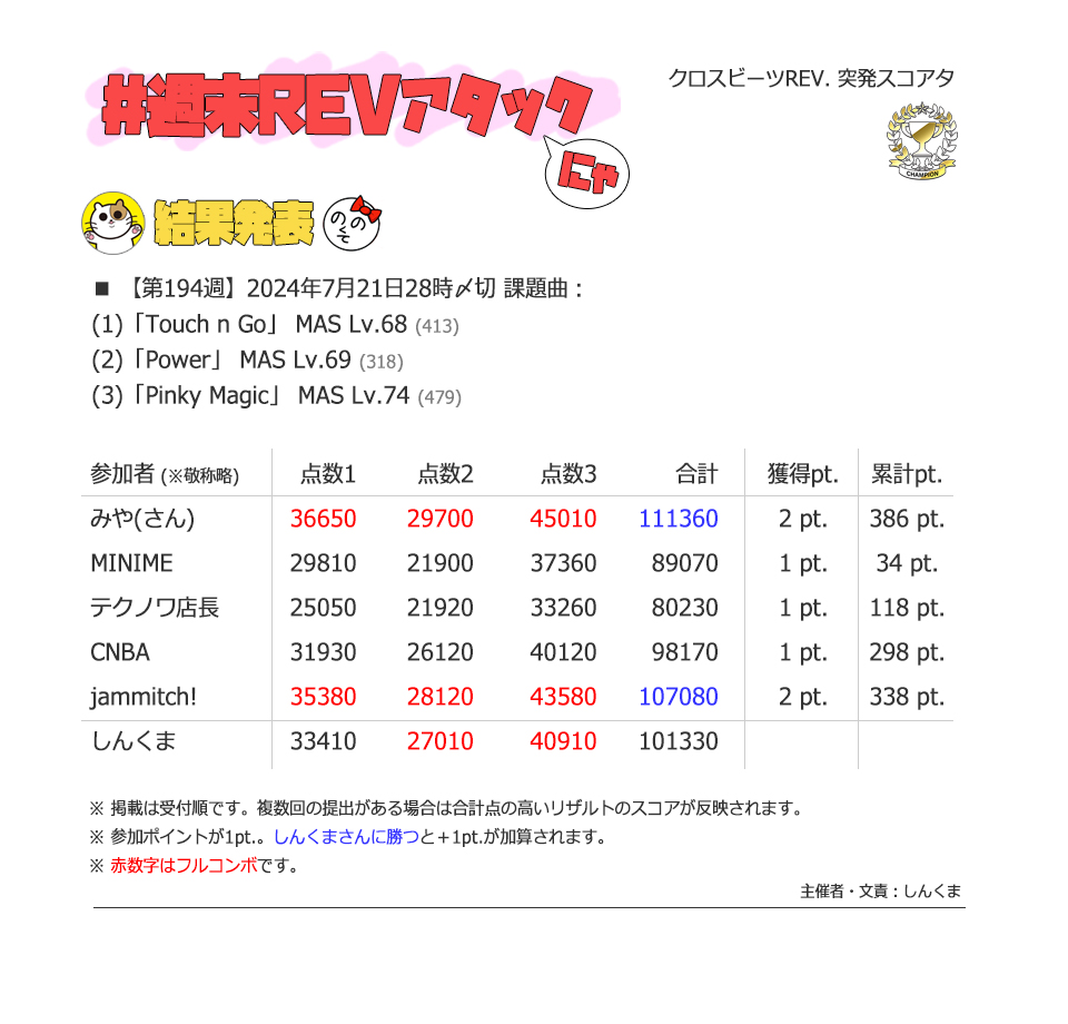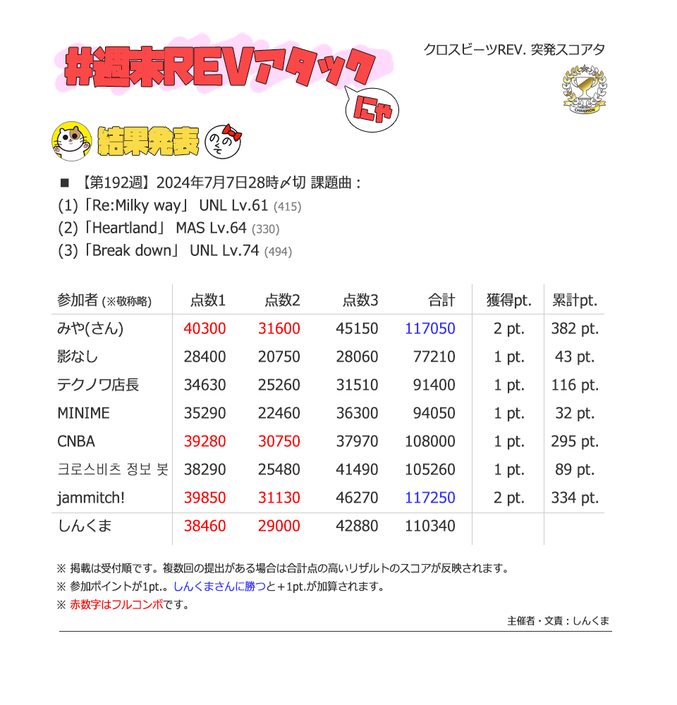 | #3 | 2020/9/27 | ちょっと変化球だけどハマると楽しい譜面 | Cthugha 73 |
