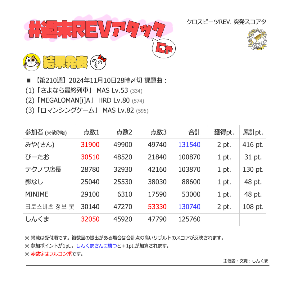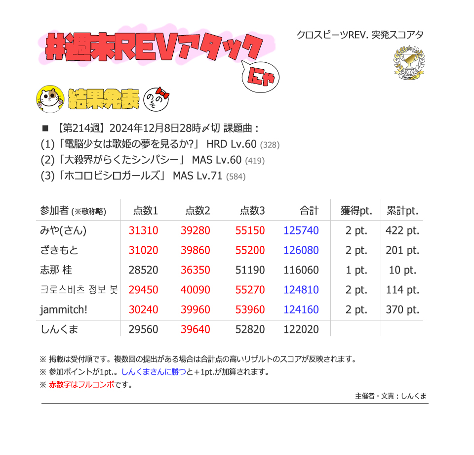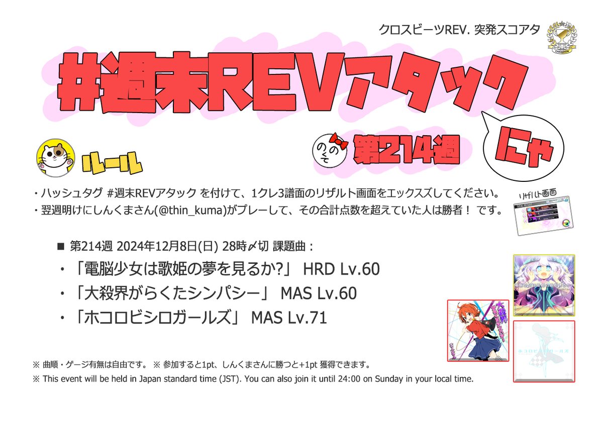| #214 | 2024/12/8 | iOS版からの移植曲・BPM200以上特集 | 電脳少女は歌姫の夢を見るか? 60 |